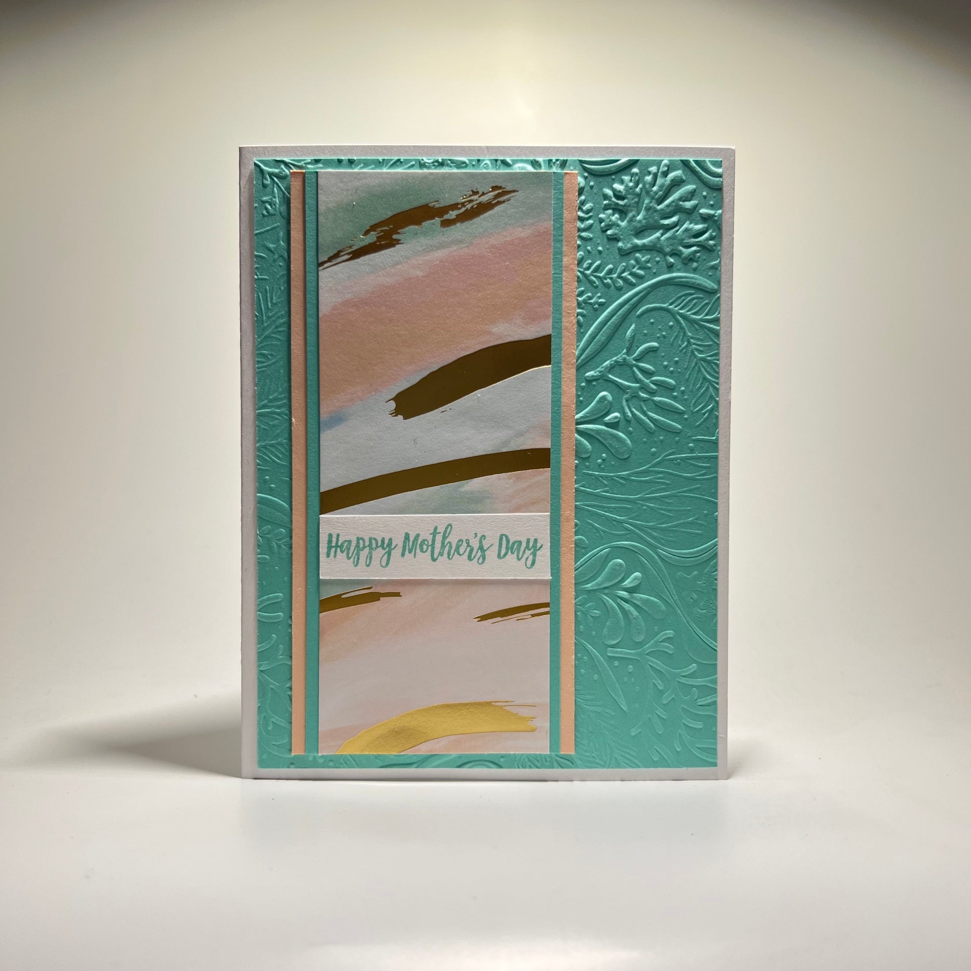 Materials: adhesive, ink, card stock, patterned paper, embossing